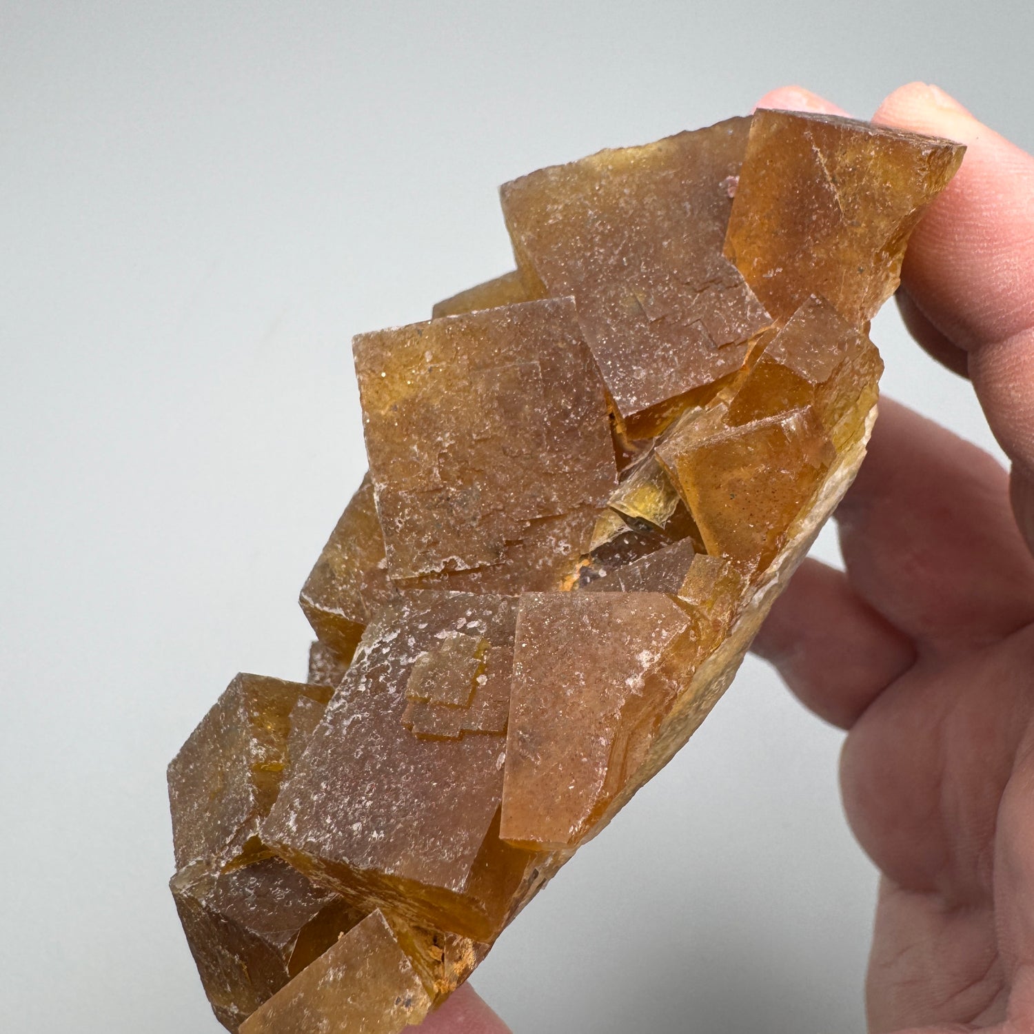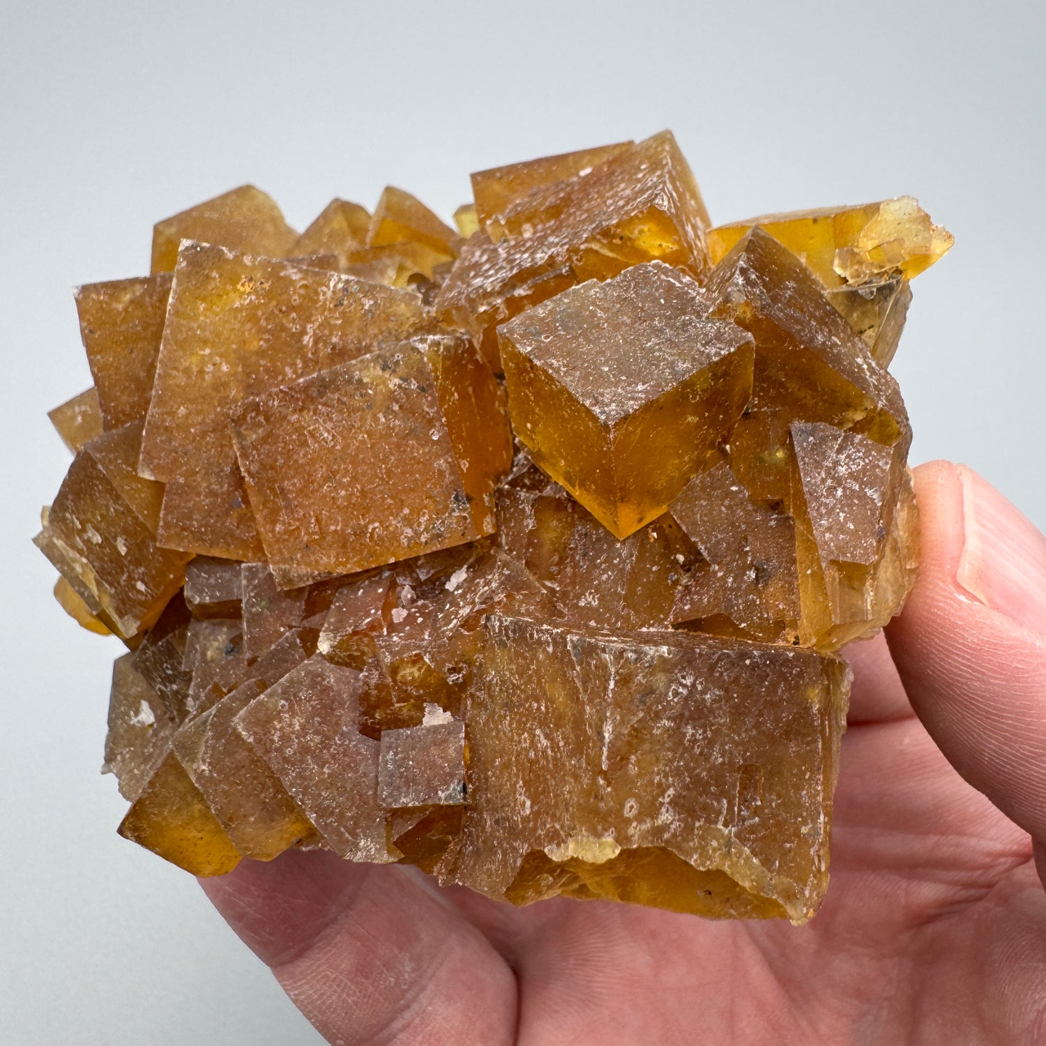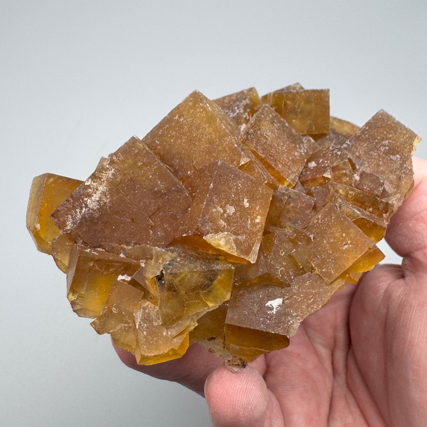 A nice specimen of orangish yellow fluorite crystals from Morocco - You don't see a lot of this material on the market - Under shortwave UV light this piece glows purple!