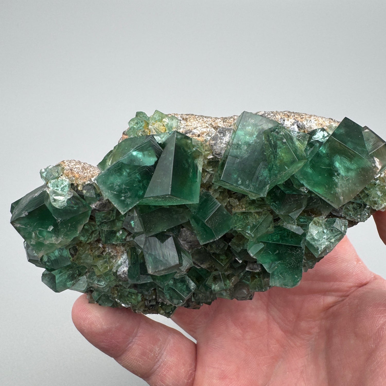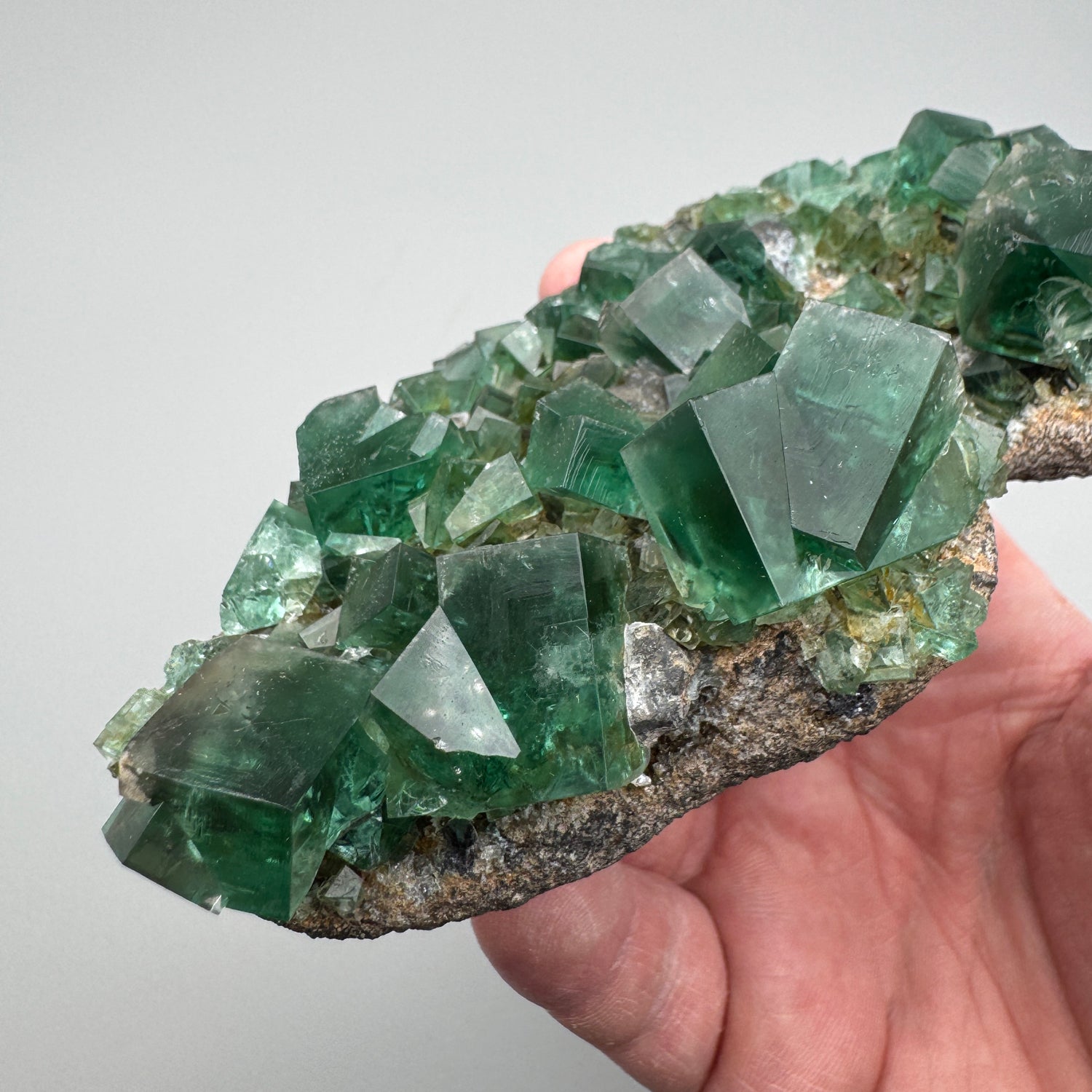 Nicely twinned rectangular crystals sit at the top of this specimen alongside a bunch more twinned crystals below. The "Penny "Pocket" was named after Penny Williamson who was curator of geology at The University of Wollongong in Australia. Many of the specimens were very large and of great quality!