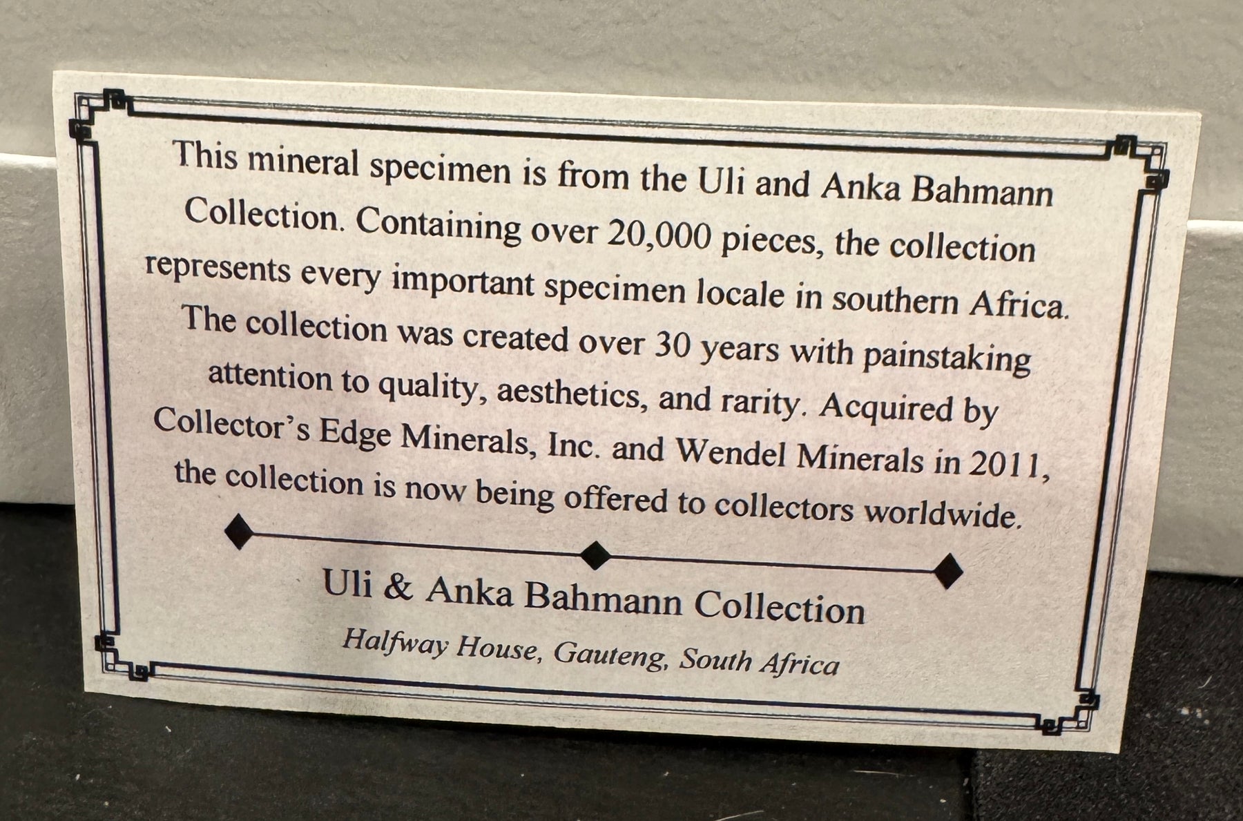 This specimen is from the legendary collection of Uli Bahmann - One of the pioneers of mineral specimen collecting throughout Namibia and South Africa. You will notice several sets of "eyes" gazing back at you across this specimen - The cover image was taken with gentle backlighting, there is very little matrix on the back so it lights up very well with a strong backlight. I purchased this specimen from Collectors Edge, in 2011 CE purchased the Uli Bahmann collection alongside Wendel Minerals. This specimen pre-dates the 2020 “Alien Eye” discovery but was not labeled as specifically being from the 2007 “Alien Eye” pocket so I have no way of knowing if it was part of that find - But, I do know for certain it’s from that original find era and because of Uli’s prominence in the area it’s likely from the original area and time frame.