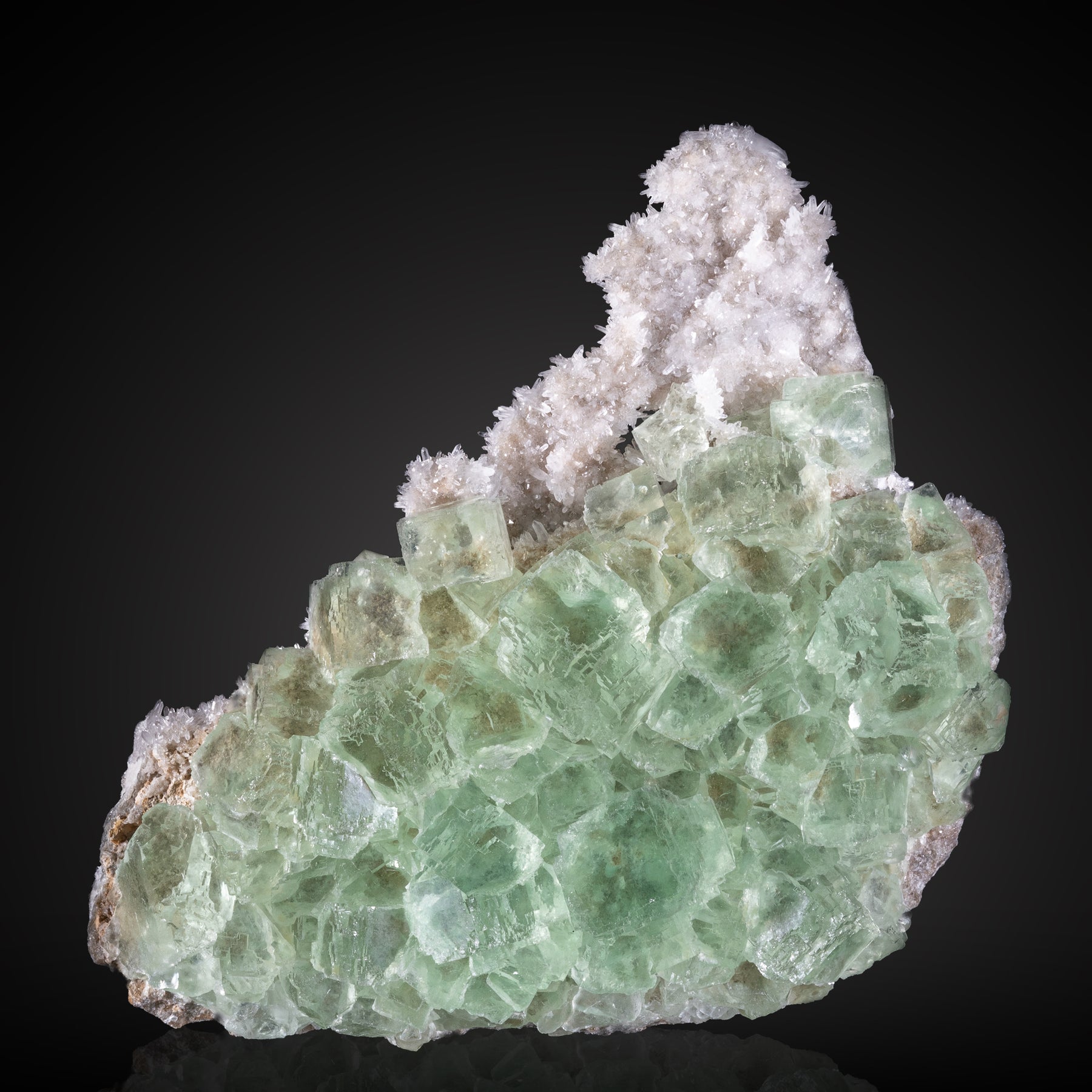 We are calling this piece "Key Lime Pie" because it strongly resembles a slice of pie when viewed from a certain angle (2nd Picture) - Densely packed lime green fluorite with stepped formations feature great luster and clarity. Across the upper portion and on the reverse side bristling quartz crystals contribute to the great form, color and tactility of this specimen.