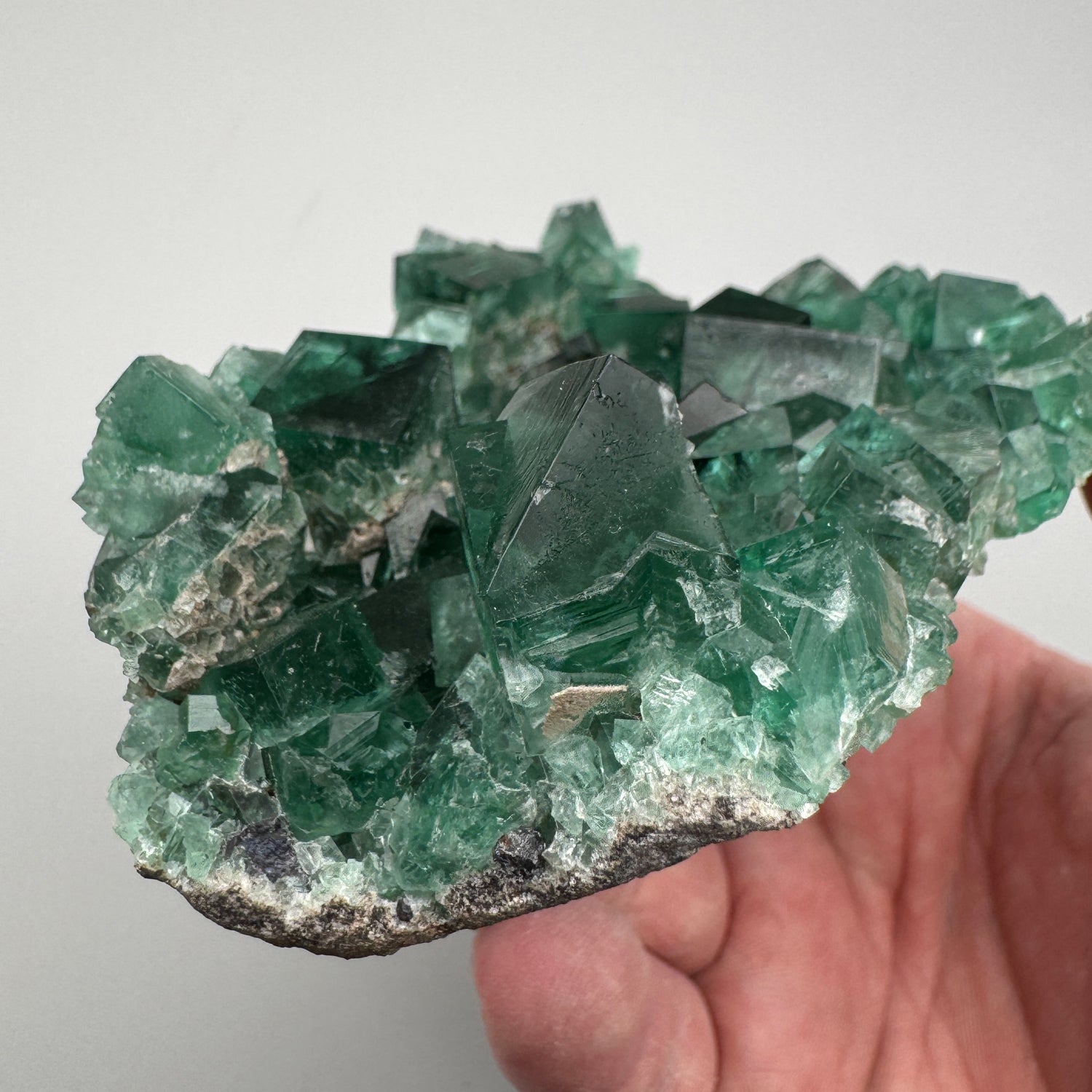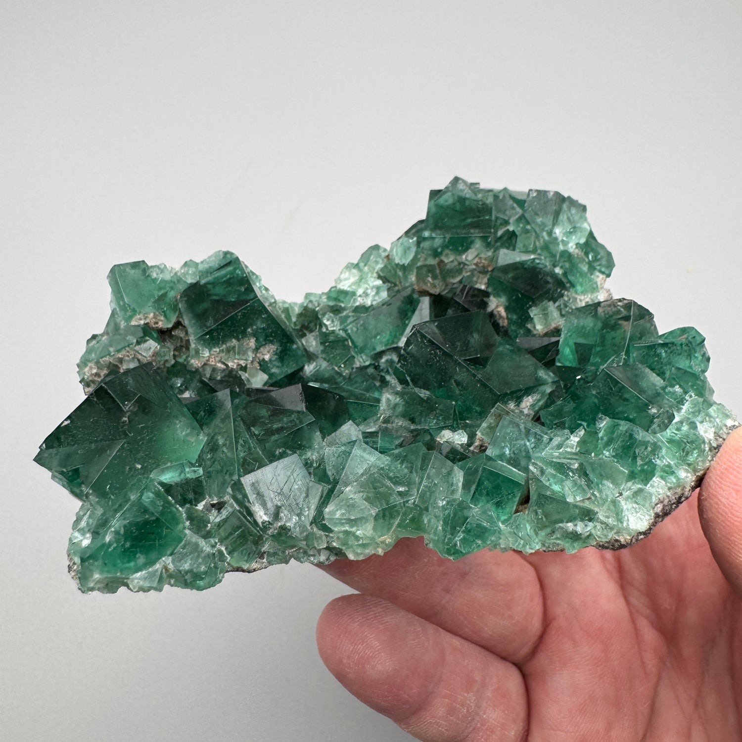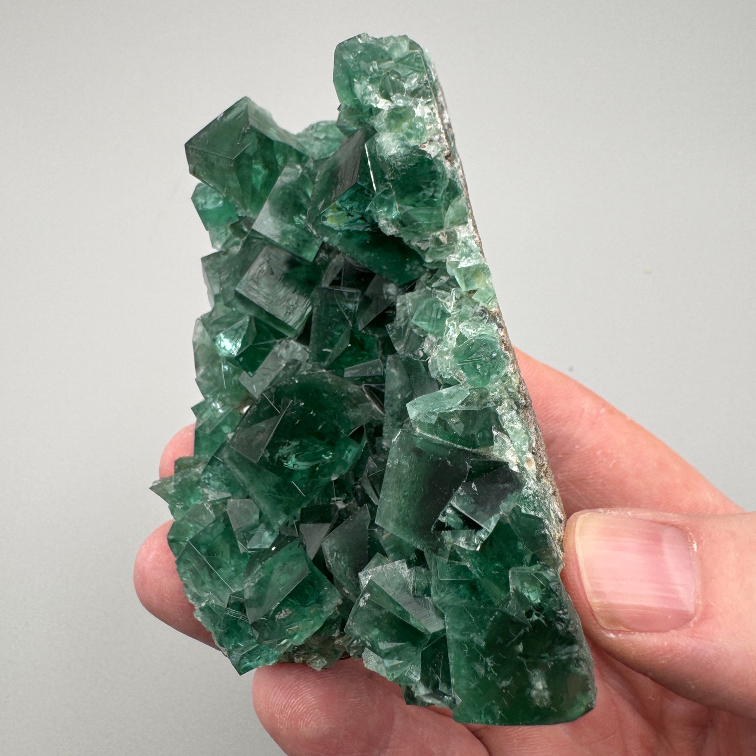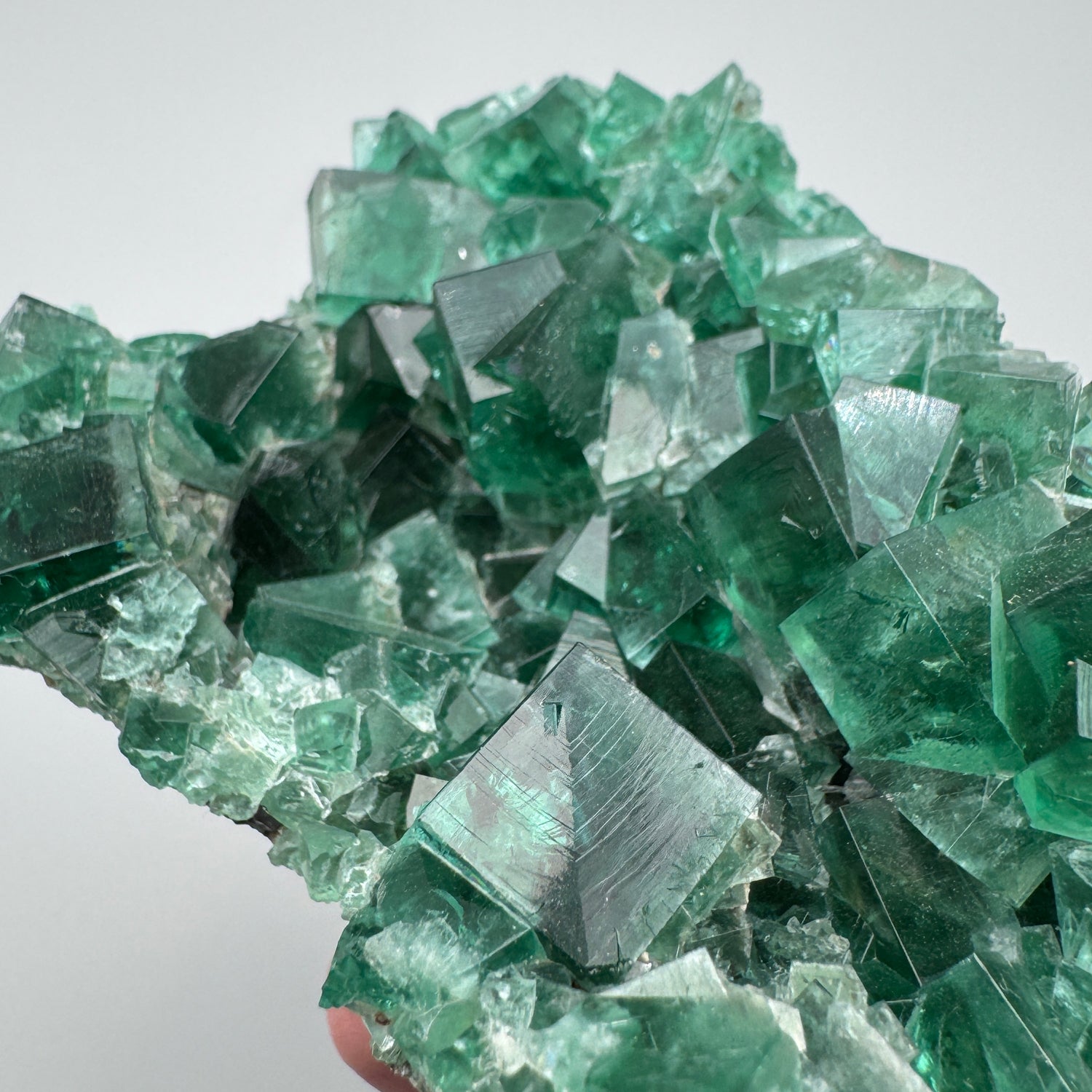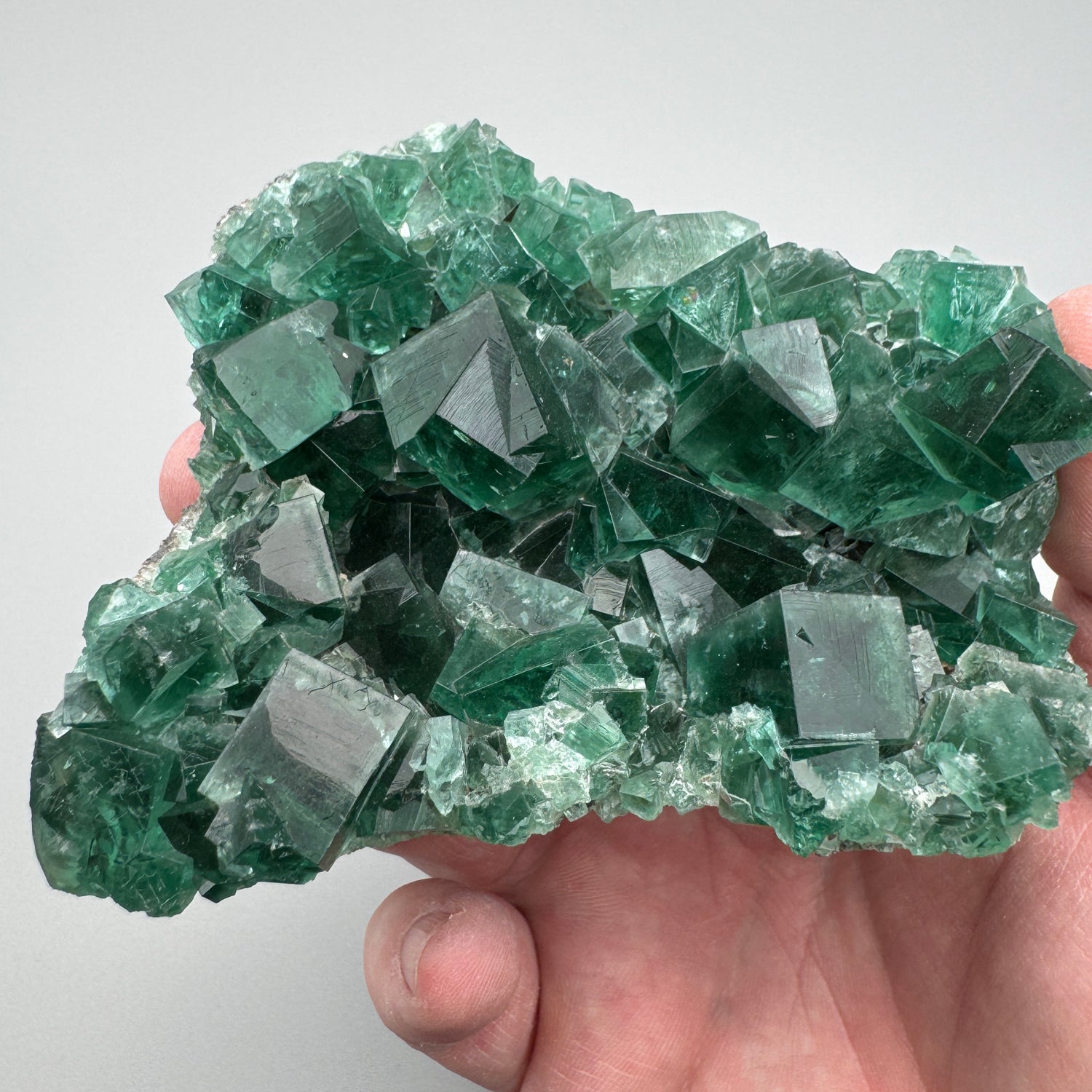 Multiple penetrating twin crystals and perfect cubes collapse into a vertical vug giving this piece fantastic depth. On several of the prominent crystals great etching patterns are present which adds even more character to this strong specimen. As you can see in the pictures, the UV reaction is bright and to top it off the daylight reaction is equally stunning.
