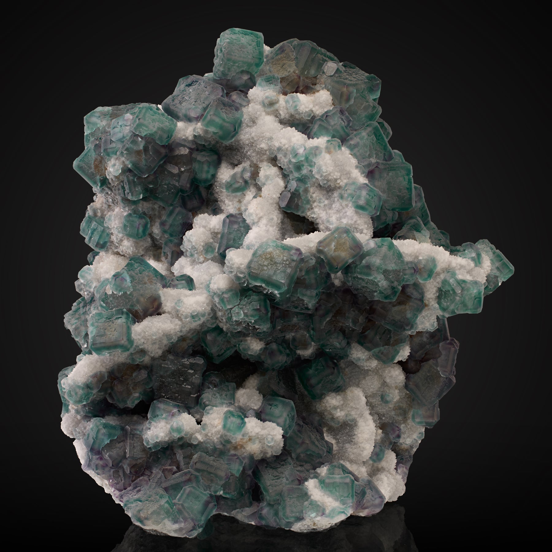 This is a large and unique specimen of highly modified fluorite cubes on a beautiful quartz matrix from Xia Yang Mine in China. Often referred to as “QR Code” fluorite, the cube faces formed into a pixelation effect that is unique to this location. The front facing side of the specimen is covered in beautiful teal and light blue fluorite crystals growing on and within the protrusions of quartz matrix. The reverse side features many small fluorite crystals resulting in a druzy of fluorite coating the quartz. On close examination you will notice purple phantoms and bluish green zoning and in some areas the quartz within the fluorite is partially exposed. You will also notice a slight shift of green to blue fluorescence between natural light (warm) and LED (white) lighting. The different interactions between fluorite and quartz across this piece make it a joy to view from a distance or up close, if you love unique and beautiful fluorite specimens this piece would be a great addition to your collection.