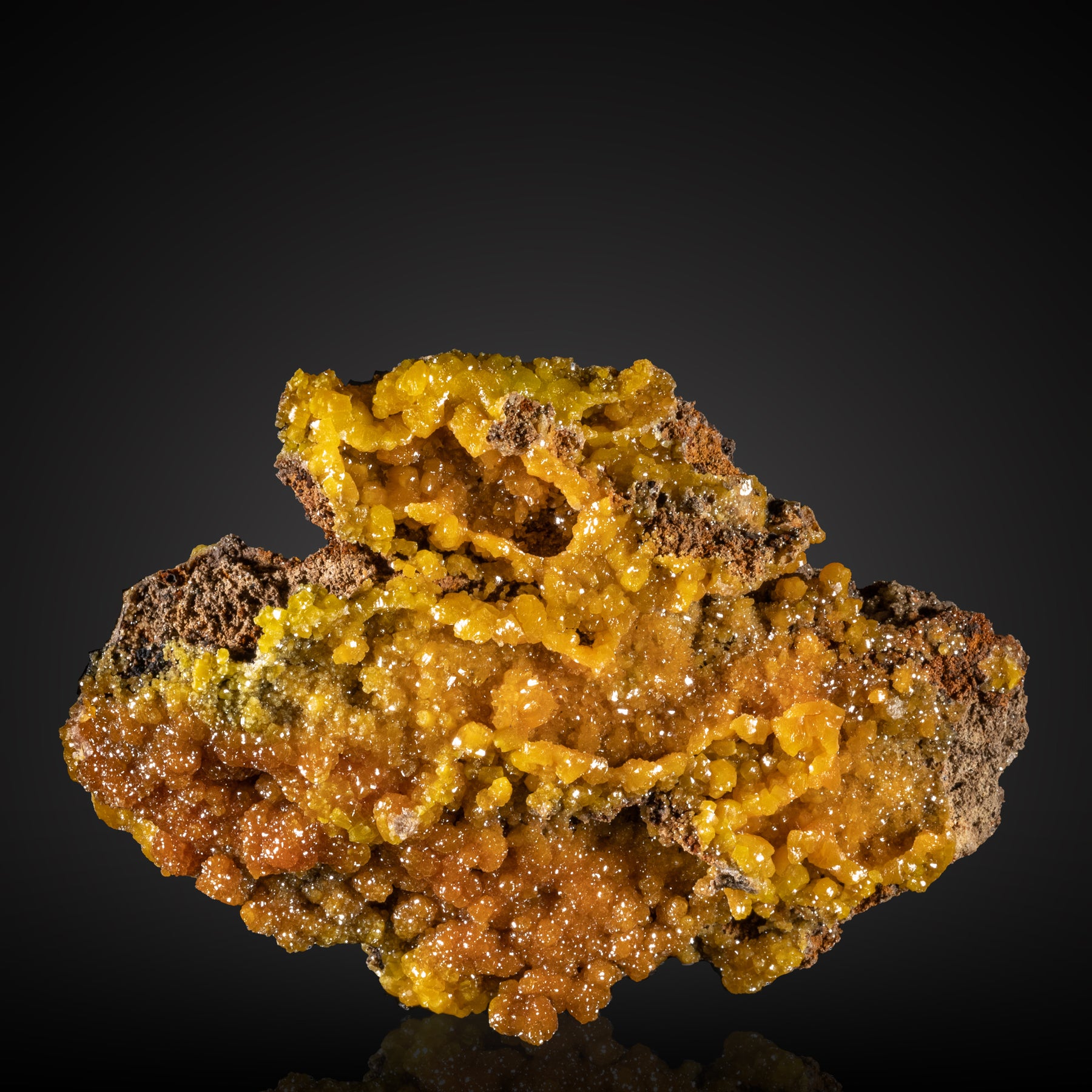 A stunning example of pyromorphite featuring a gradient of lustrous green, yellow, orange and brown crystals bubbling up across the specimen. The layered matrix promoted interesting crystal growth on the ridges and in the nooks. If you collect American mineral classics or pieces with unique aesthetics this is a perfect piece for your collection.