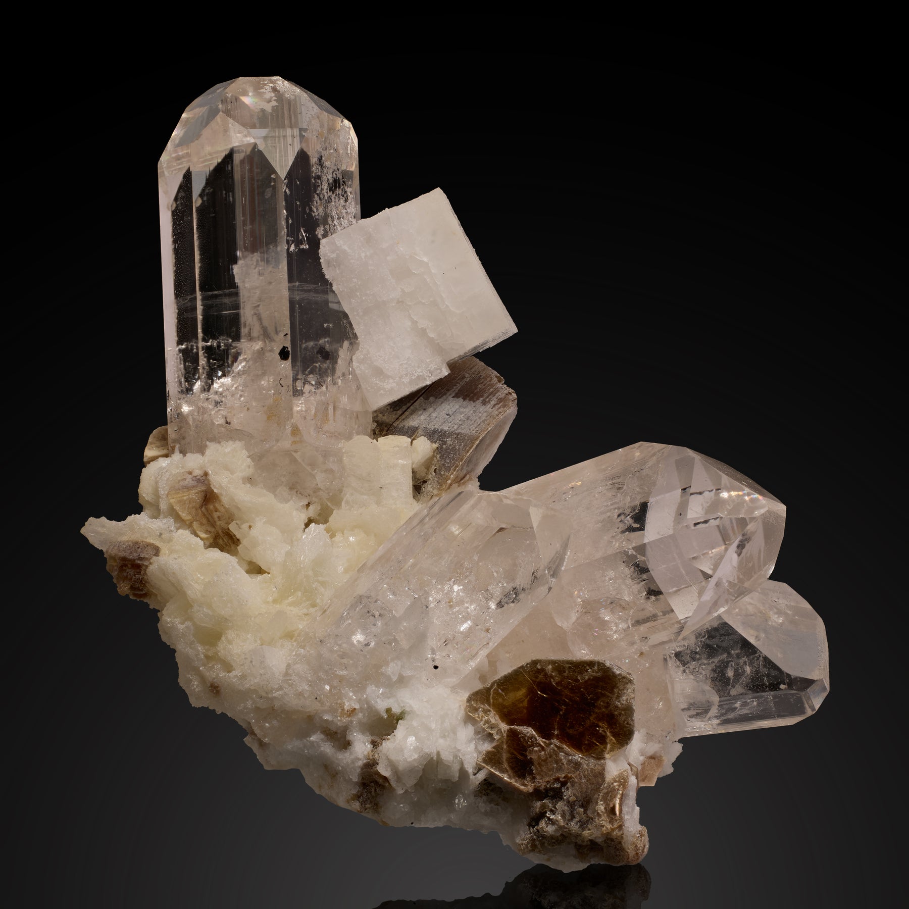 This is an exceptional specimen of water clear Topaz from the well known topaz locality of Nujiang Valley, China. There are 4 perfect topaz crystals emanating from the albite matrix with the largest measuring 3cm. All of the topaz crystals have fantastic terminations and clarity. To top it off, the focal crystal has a penetrating albite crystal that appears to be supported by a suite of muscovite "books" underneath. Overall this is a top quality specimen for the locality and it's no surprise it once resided in the famous Jim & Gail Spann collection.