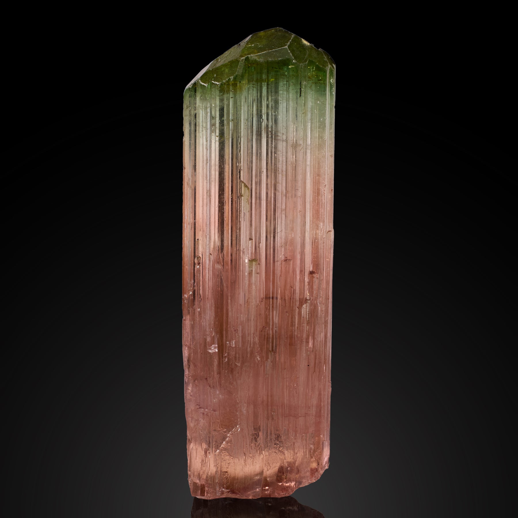 Tourmalines from the Rubaya region of DR Congo have quickly become some of the finest gem crystals to be brought to market in recent memory. This specimen features great bi-color saturation in combination with a very nice complex termination. You can see it has nice "gemmyness" when held to a light source and looks great on display.