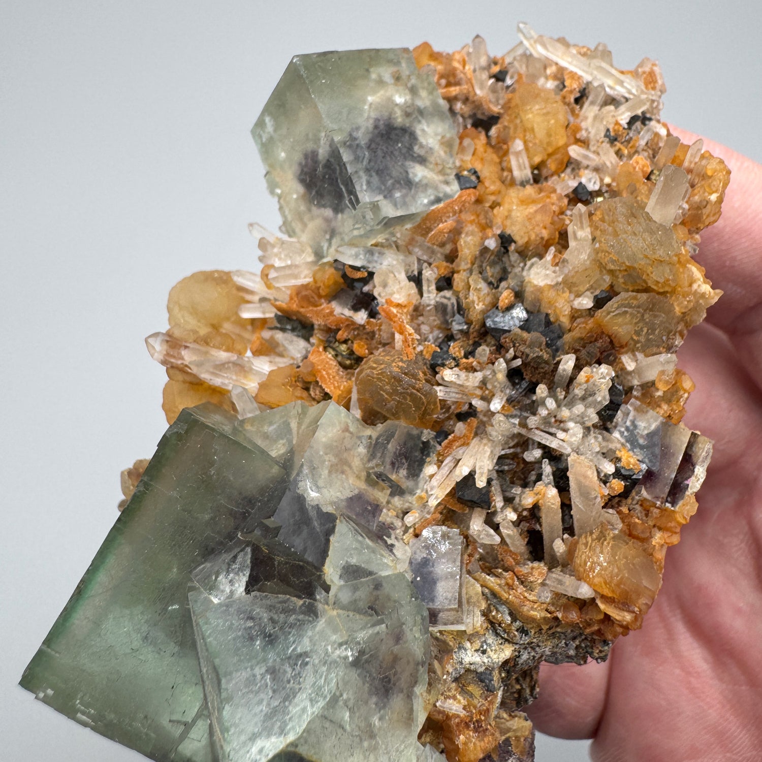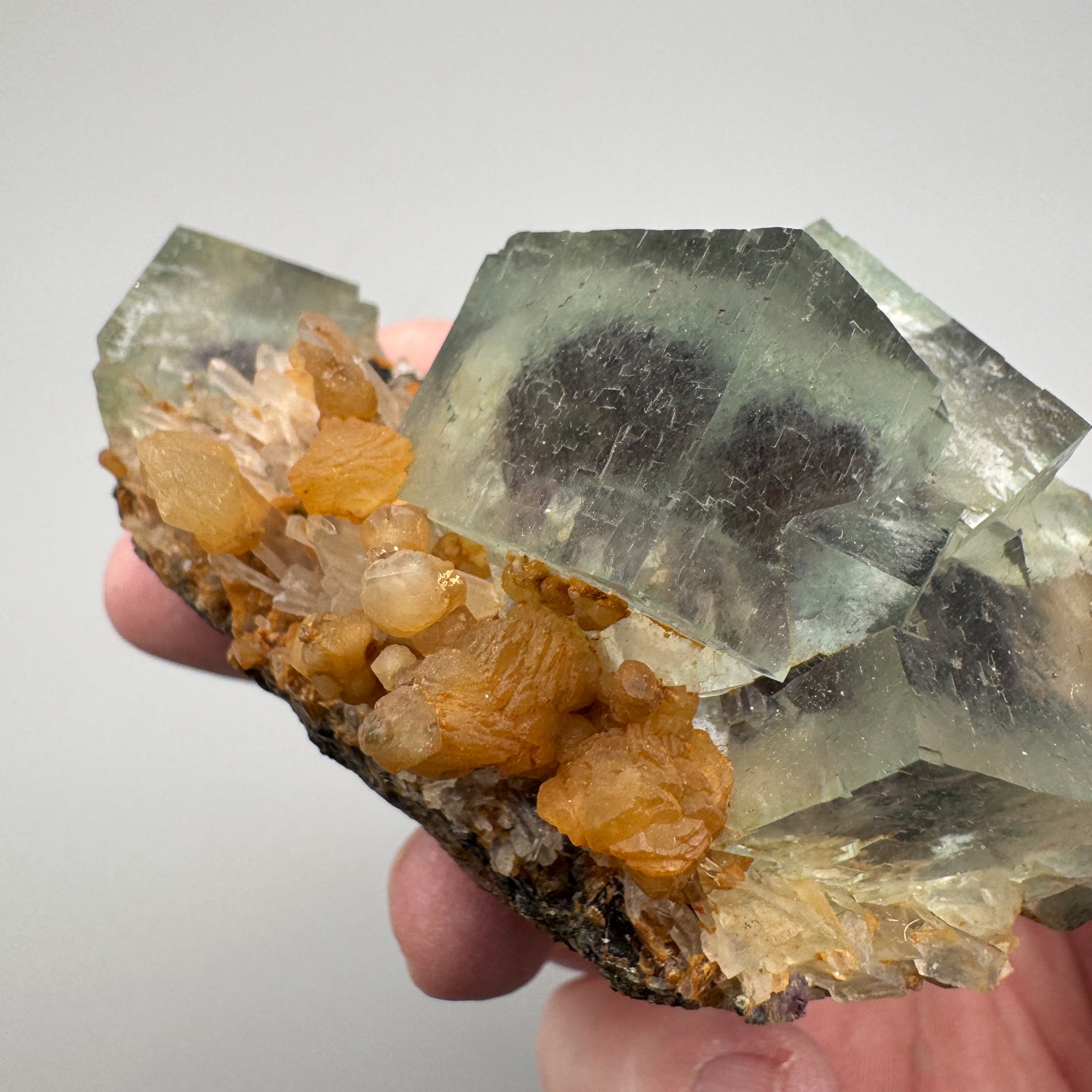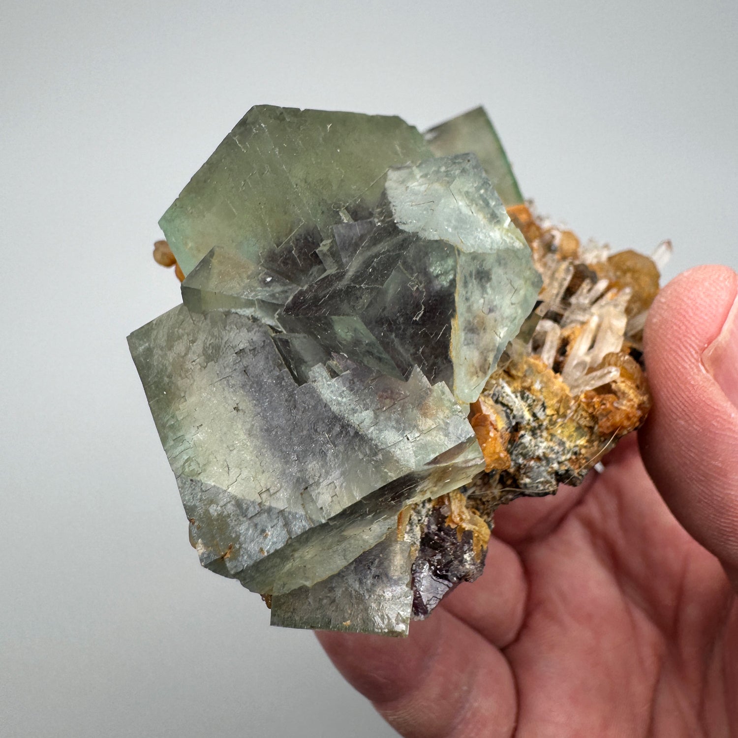 An interesting specimen of classic phantom fluorite crystals from Yindu Mine on a matrix of quartz crystals with globs of calcite perched throughout. Multiple twinned fluorite crystals with excellent etching and clarity are offset by a single fluorite crystal with great inclusions. The fluorite crystals exhibit bluish-green zoning with a dense purple phantom core. There is a strong contrast of colors and form between the fluorite and the surrounding minerals that makes this specimen uniquely aesthetic.