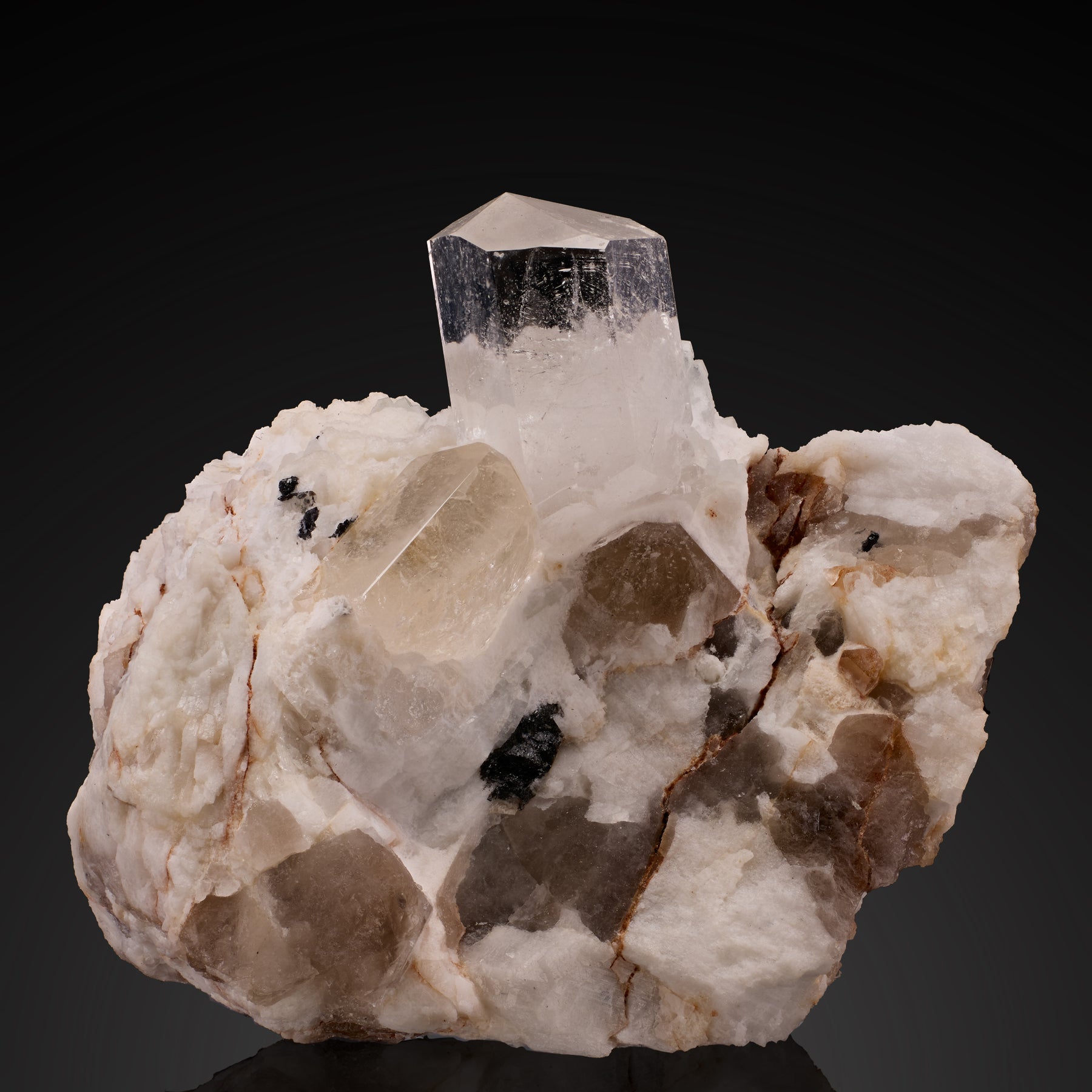 Phenakite specimens from Myanmar (Burma) are considered to be amongst the best in the world. Single crystals are the most prevalent on the market so this beauty on a microcline and smoky quartz matrix is much more rare. The gemmy and sharp focal crystal perched on top of the matrix measures 1.5(H) x 1(W) centimeters and is a perfect example of a twinned "drill-bit" termination - To top it off.. the phenakite is double terminated! It is safe to say this is a KILLER specimen to add to your collection!